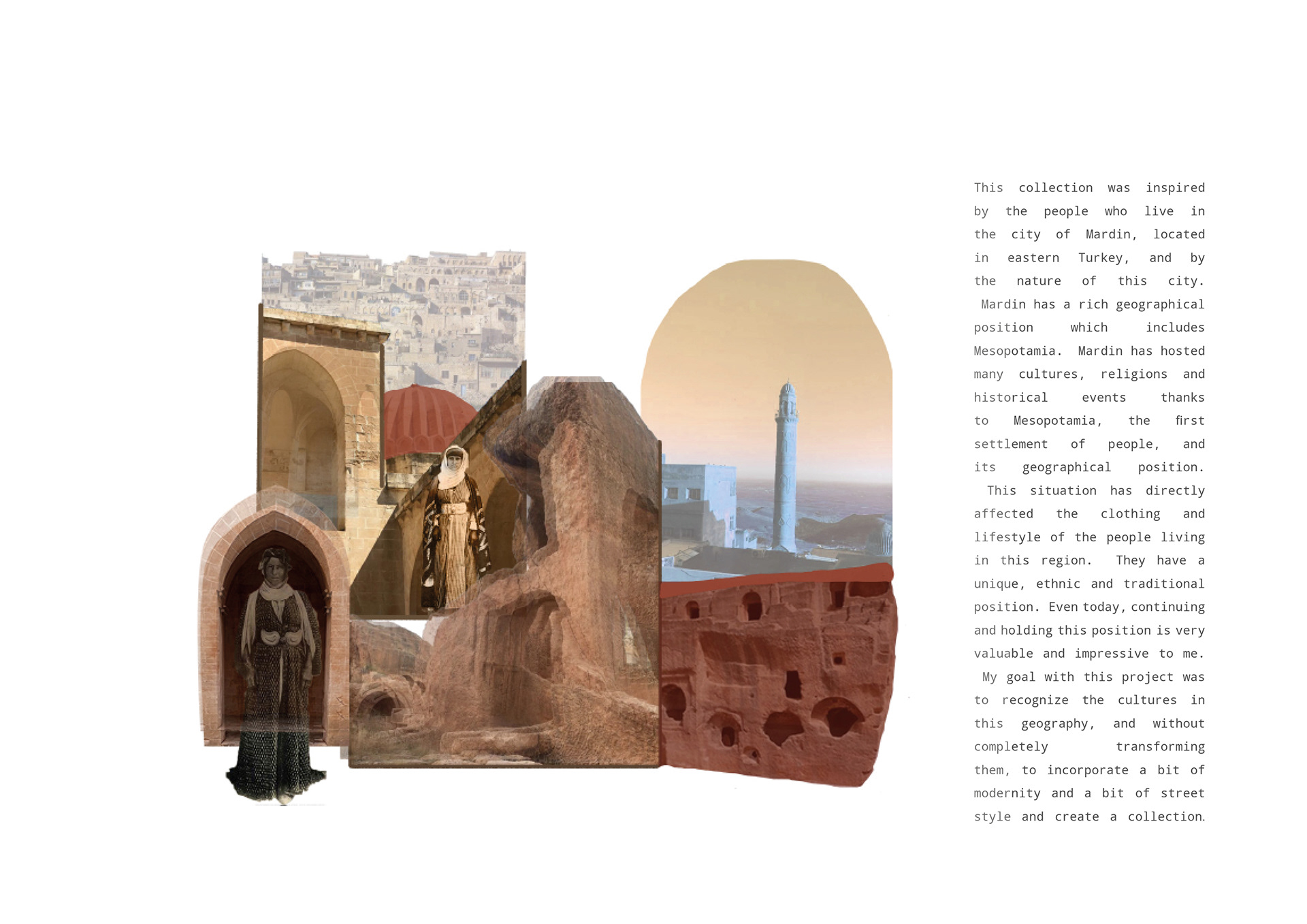 This collection is inspired by the people and the land of Mardin, which is a city defined by the multicultural tradition of Mesopotamian background, the blend of cultures, religions and history in the eastern part of Turkey. The traditional culture of ethnic and traditional clothing, which has been preserved through generations, is very powerful and has relevance to this day. This project aims to honor those traditions while subtly introducing modern and street-style elements to create a contemporary collection.